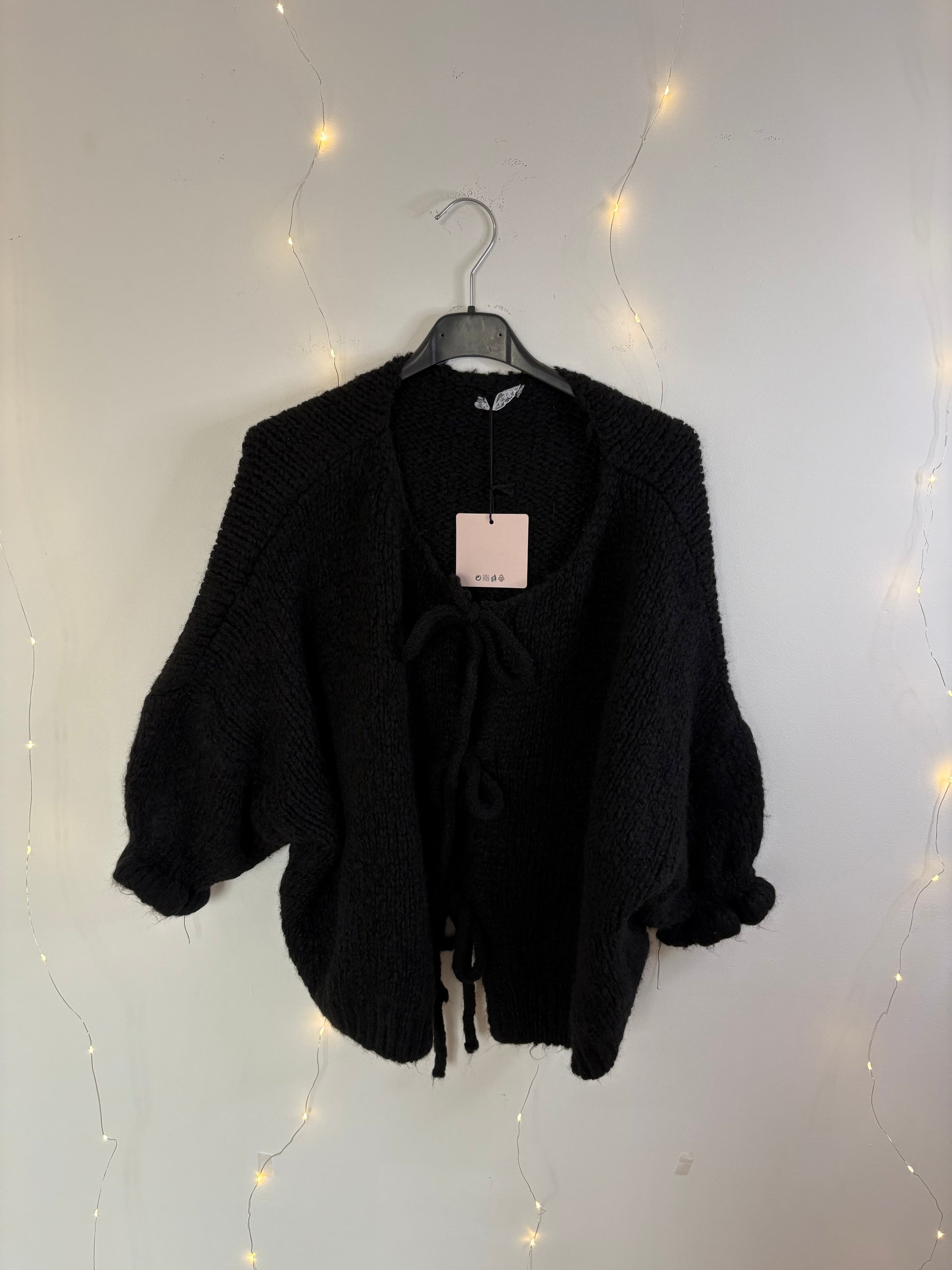 Le gilet Diablo, c’est la version classique de ton gilet chouchou. Même maille fluffy, même coupe oversize, mais en noir profond pour un look à la fois chic, cocooning et un brin rebelle. Avec ses manches bouffantes et ses nœuds à nouer, il se porte aussi bien en full black qu’avec une touche de couleur.