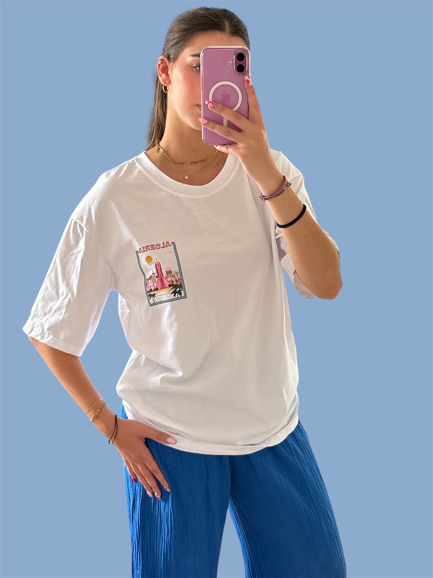 Le T-shirt ALGÉRIE Blanc, c’est l’indispensable qui fait matcher fierté & minimalisme. Son imprimé graphique “Algeria”, sa coupe oversize mixte et son blanc éclatant en font un basique iconique à porter toute l’année 🇩🇿✨